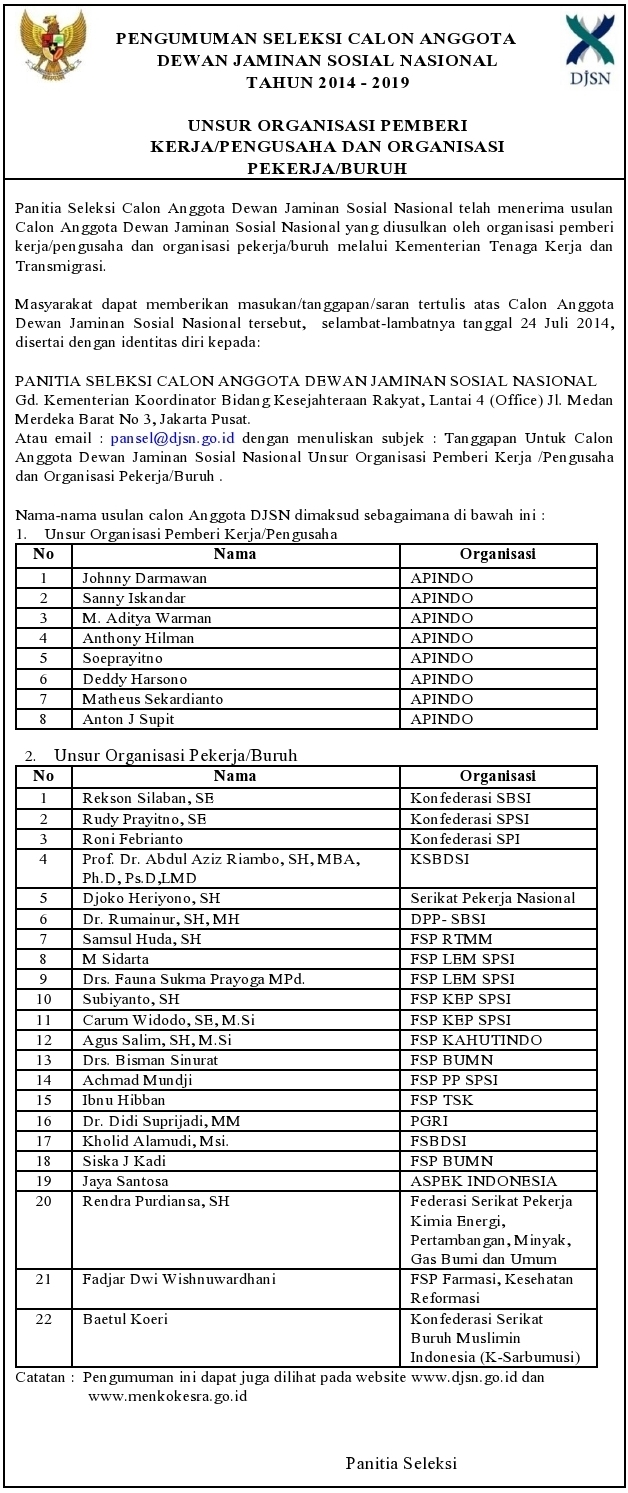 Berikut pengumuman seleksi calon anggota DJSN periode 2014-2019 Unsur Organisasi Pemberi Kerja/Pengusaha dan Organisasi Pekerja/Buruh
